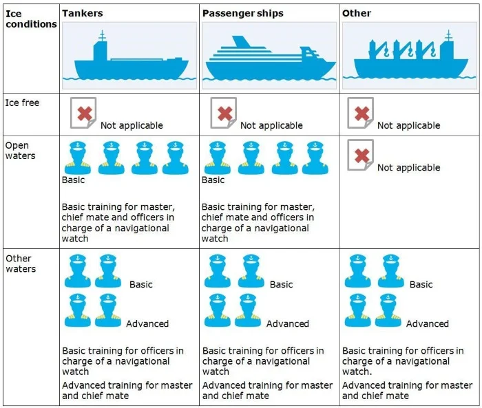 • É exigido aos comandantes, imediatos e oficiais responsáveis por quartos de navegação, que trabalhem em navios que operem em “open waters” em regiões polares (definidas como águas navegáveis em que a concentração de gelo marinho é inferior a 1/10), a certificação em formação básica para navios que operam em águas polares, após participação em formação específica, de forma a atingirem o padrão de competência requerido.